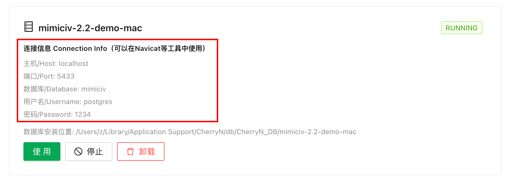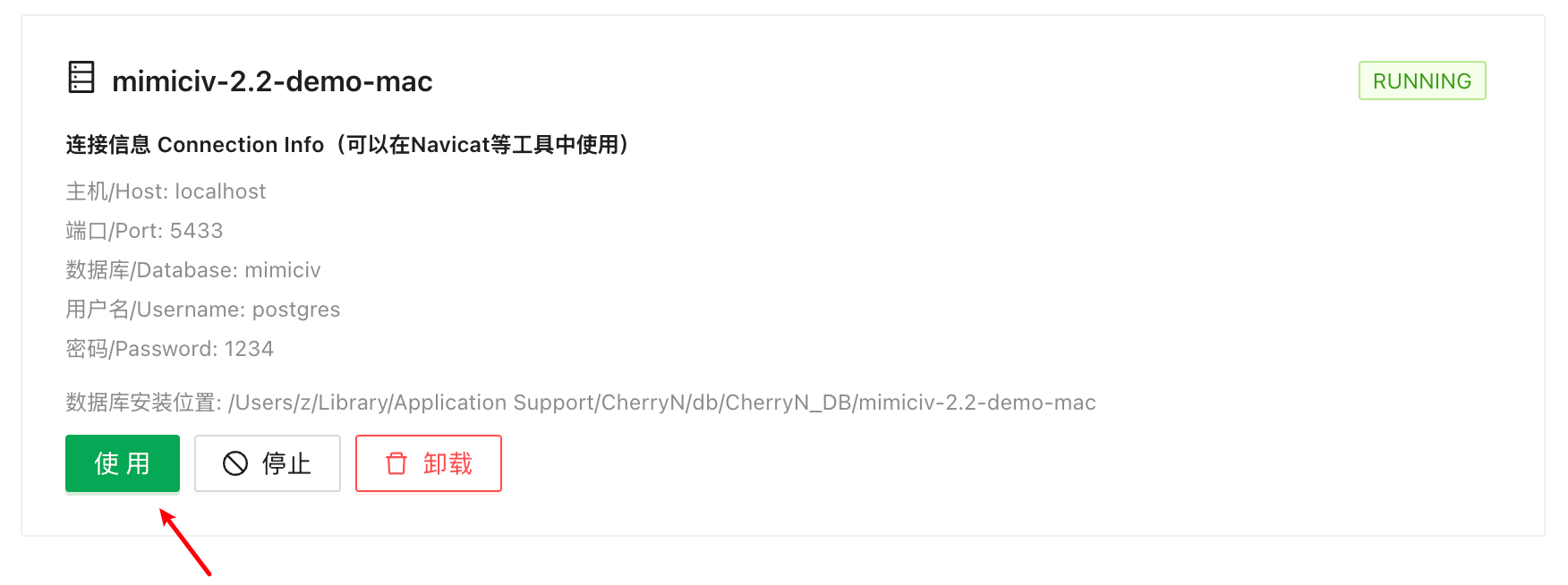 已安装的数据库列表中展示了连接信息(包括数据库名称、用户名、密码、端口等),可使用这些信息在 Navicat 中连接。